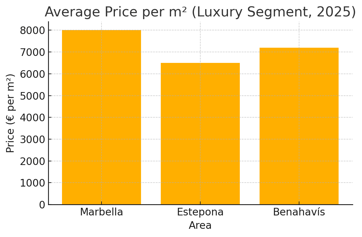 - Marbella: approximately €8,000/m² for newly built or fully renovated villas.