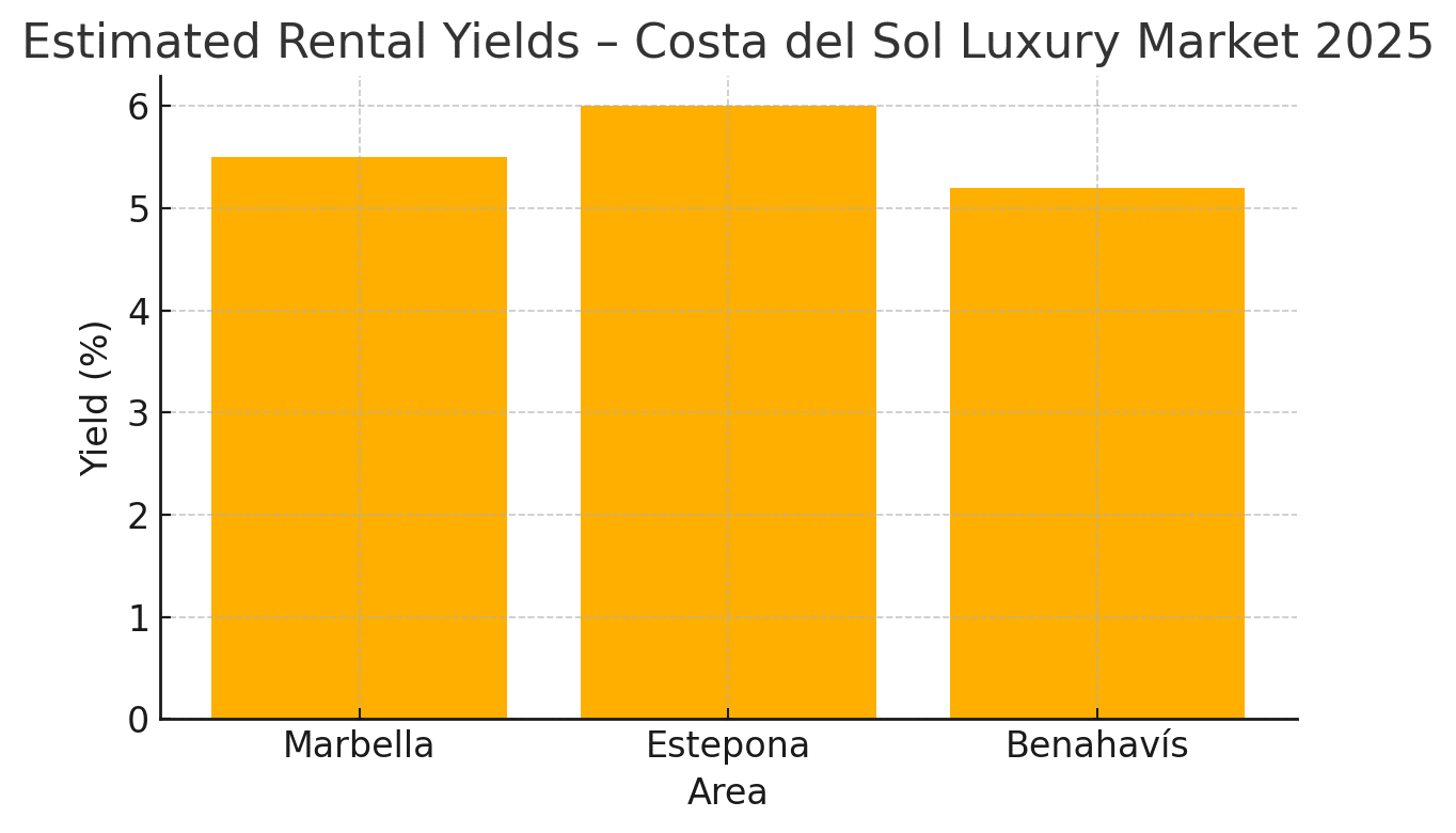 The Costa del Sol continues to outperform other European destinations thanks to its robust year-round rental market. Estepona currently offers the highest luxury rental yield at around 6%, with Marbella and Benahavís averaging between 5% and 5.5%. Investors prioritising energy-efficient, prime-located assets can expect stable income streams and sustained capital appreciation.
