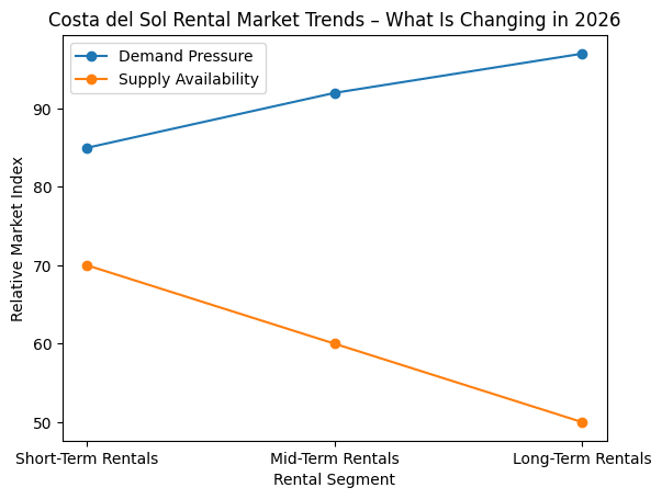 Relative comparison of demand pressure and supply availability across rental segments on the Costa del Sol in 2026. Long-term and mid-term rentals show the strongest structural imbalance.