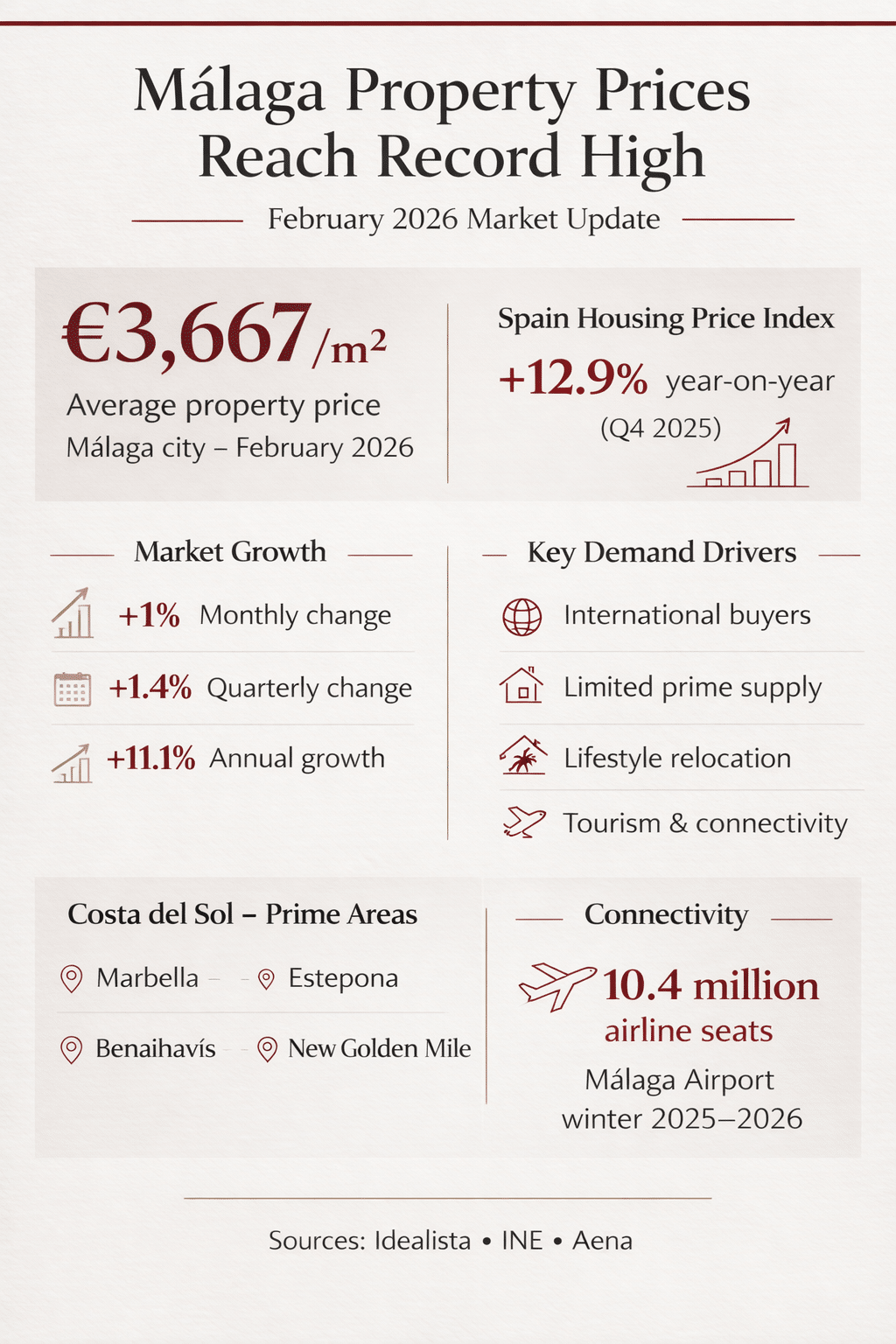Sources: Idealista price report for Málaga, INE Housing Price Index, Aena Málaga-Costa del Sol Airport.